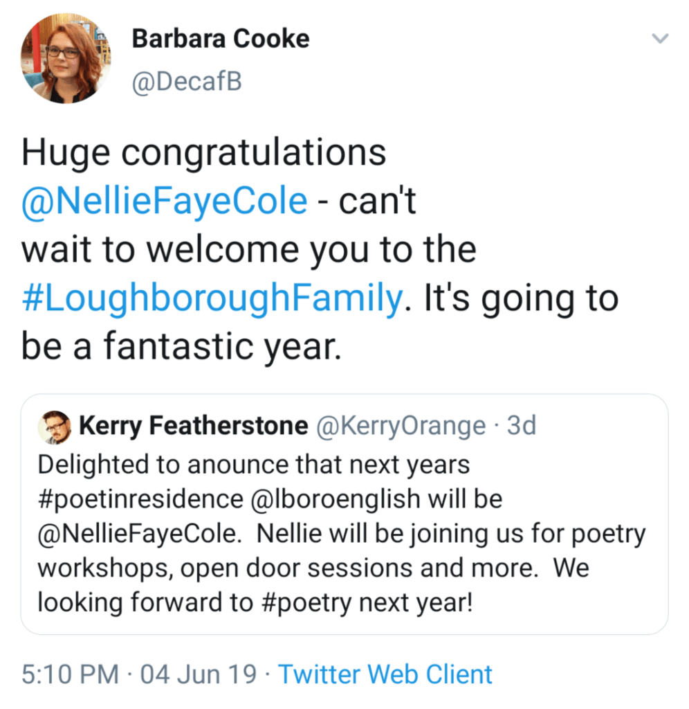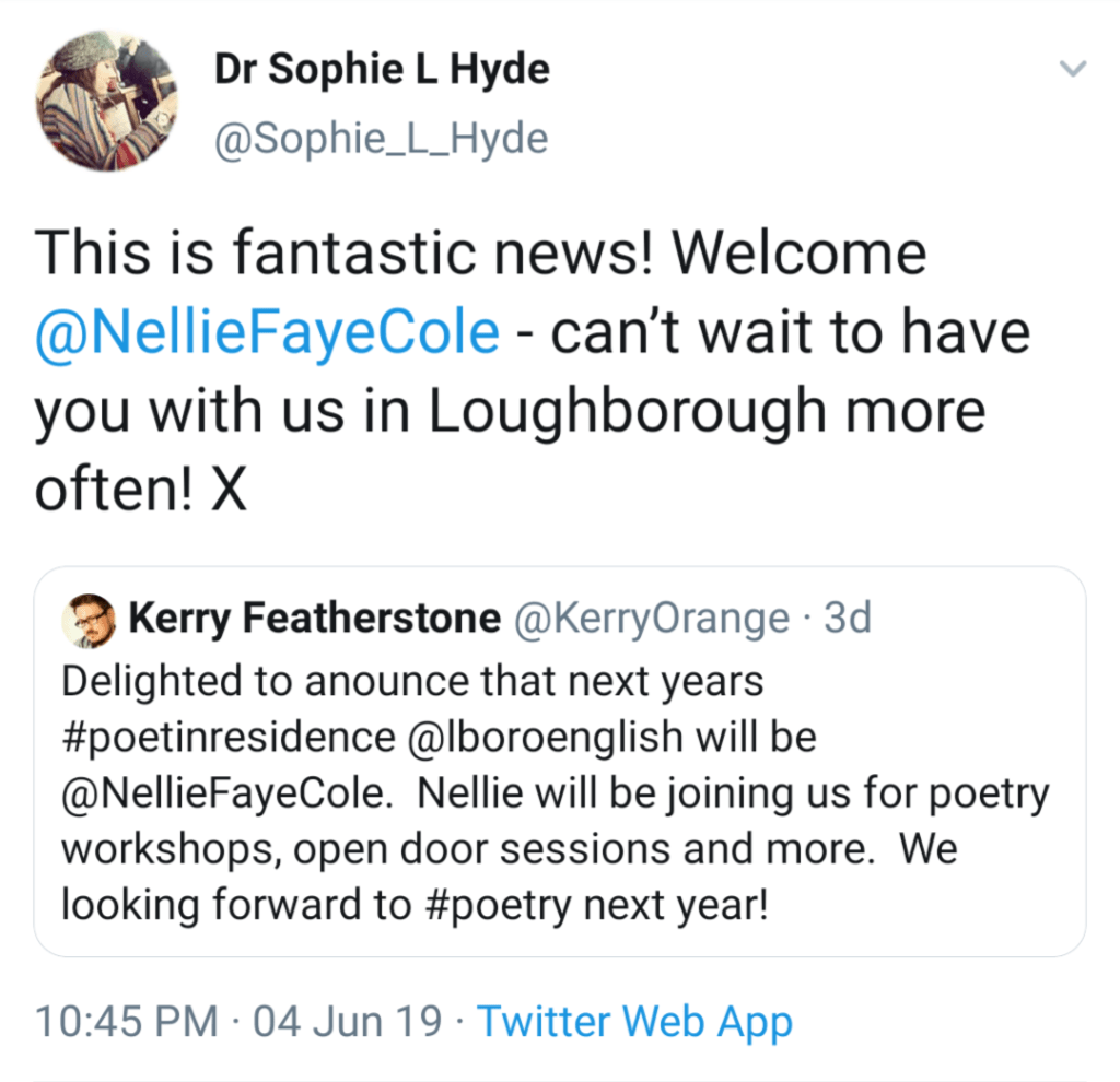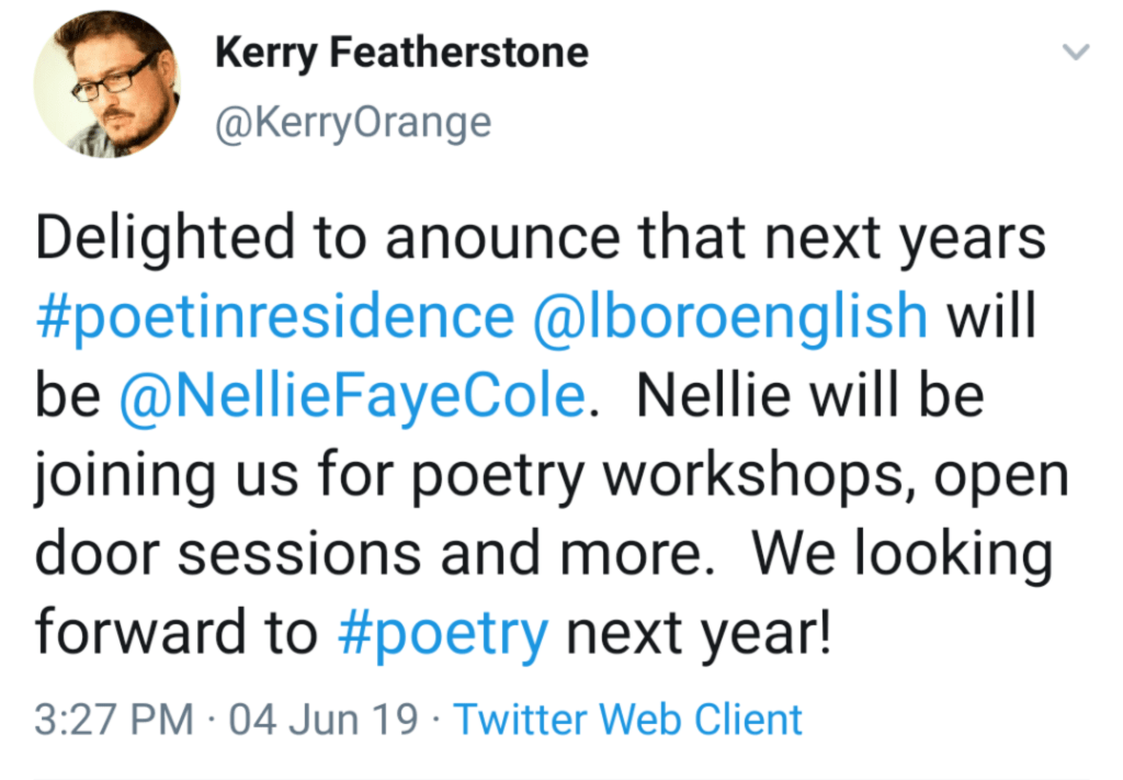 I am absolutely thrilled to announce that I will be poet-in-residence at the University of Loughborough for the academic year 2019/20!
