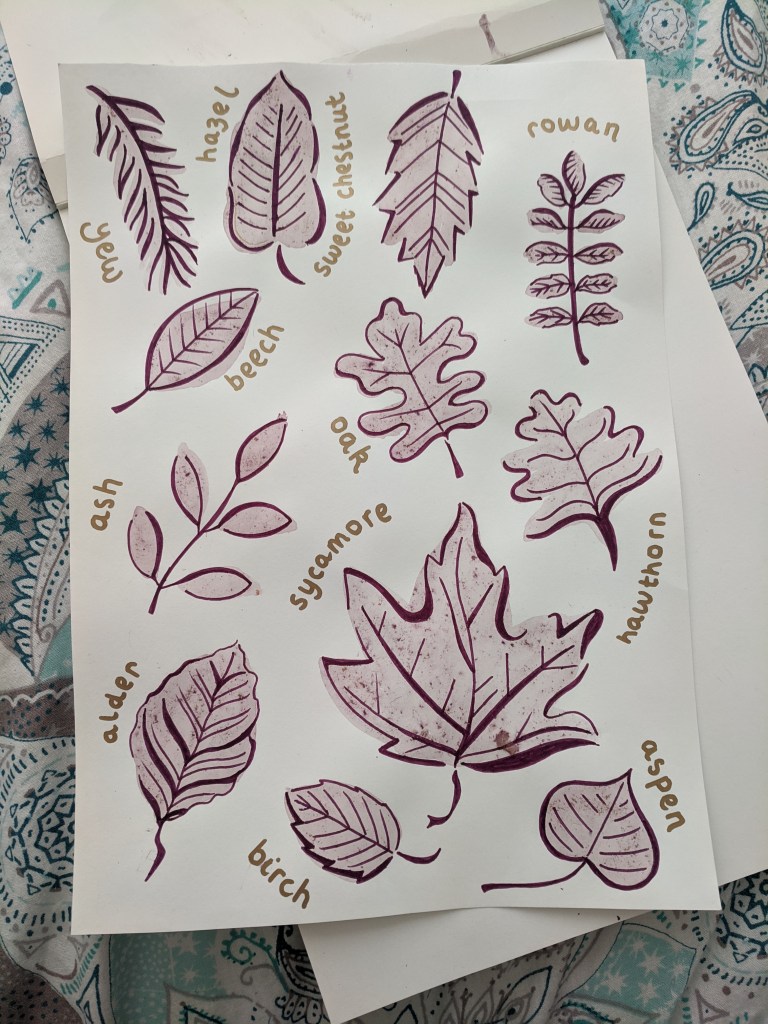 I began by painting the obvious — roses. I took inspiration from the canal folk art roses which decorate narrowboats, which you can read more about here. I used purple and gold pens to outline the shapes. I then changed my subject matter to leaves, painting rough shapes from different native British trees. Again I used the purple pen to outline the shapes, giving them more definition. I like the effect created when the pen overlaps the paint, or doesn’t quite match the edges: it gives it a more modern feel.