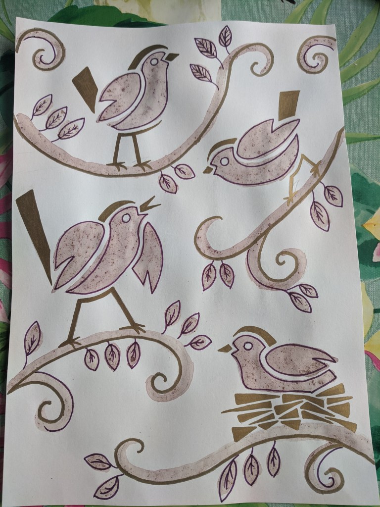 Moving away from plants altogether, I began painting stylised bird designs. While I coloured the larger parts with the pigment paint, I added other details with metallic pens. The pigment here was a little browner: I don’t know if it was mixed with too much water, or that it had steeped for a little too long. I tried again by mixing the pigment in a little less water, so the mixture was more concentrated, and it worked out better for the next painting.