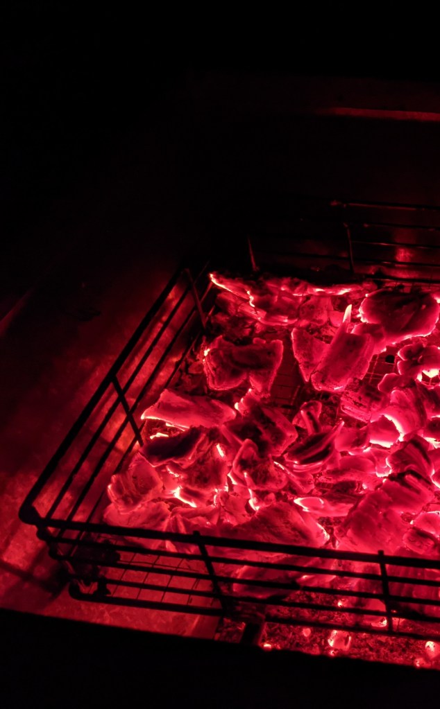 It has grown late, and the campfire has reduced to smouldering embers, which glow in the breeze that begins to creep in from the surrounding dark.