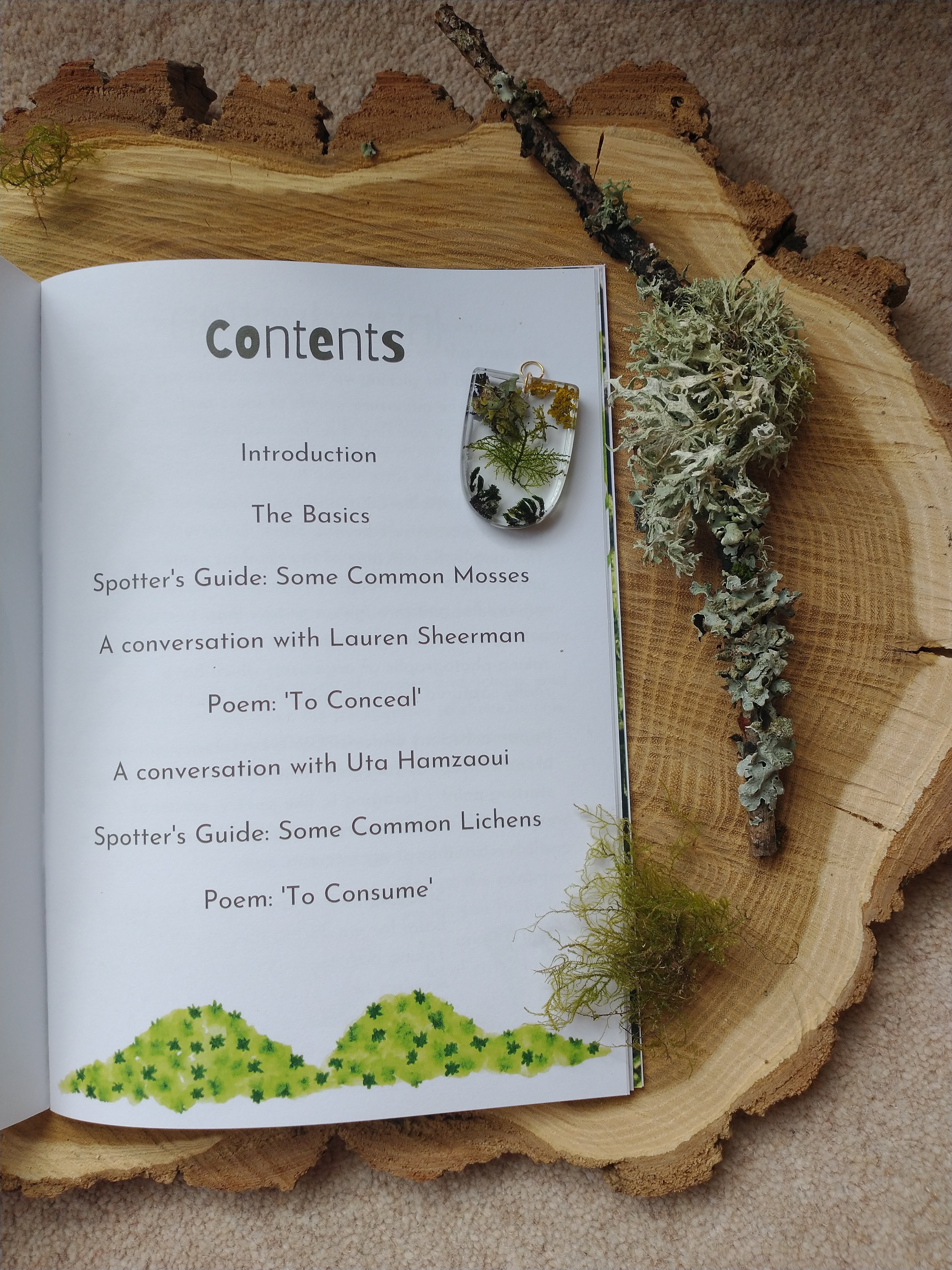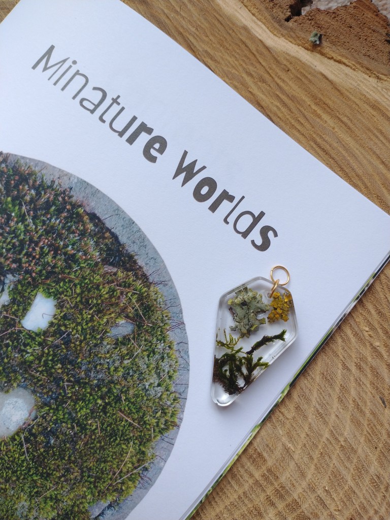 The final outcome of my residency with the underGROWTH project is a zine, titled ‘Miniature Worlds’, which takes a microscope to the hidden ecosystems we might otherwise miss. The print copies of the zine were paired with small resin pendants I made at home, containing moss and lichen collected sustainably from my local countryside. The zines were printed on recycled paper with chemical-free, vegetable-based inks, and packaged in recyclable and biodegradable cellophane.