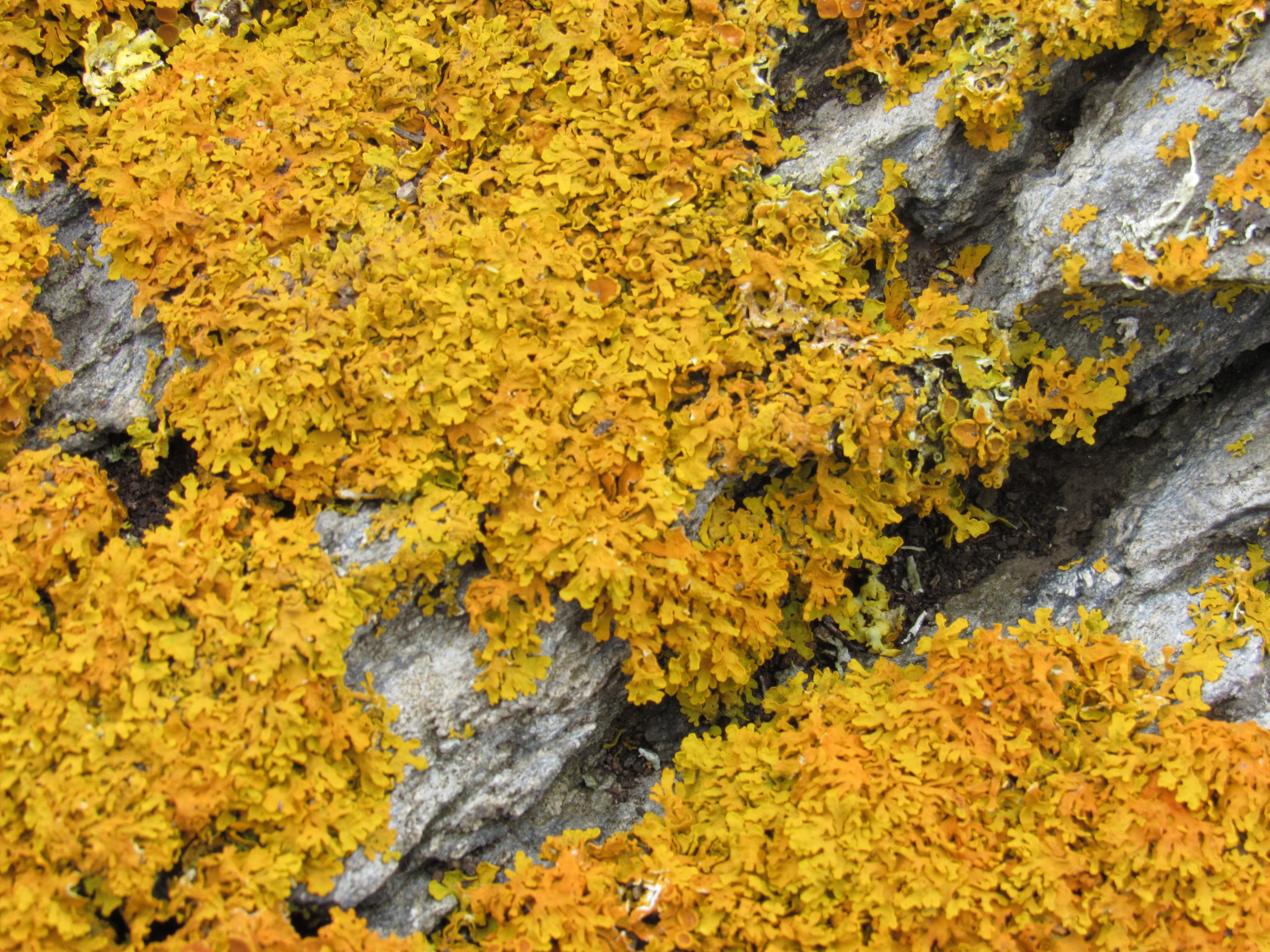 Perhaps a little later in the summer, these were taken when I went camping in Cornwall. Coastal regions boast a huge variety of species, often standing out vibrantly against rugged coastal backdrop of headlands and cliffs. The lichen in the left-hand photograph is Xanthoria parietina, also known as yellow scale, shore lichen, or – quite poetically – maritime sunburst lichen. In the bottom-right, another species of lichen, this one lumionous, almost neon. The moss that topped the beached boulders in the top-right photo was as bright and neat as turf on a golfing green.