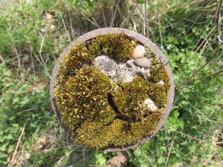 I took these photos on a day in April, just as winter was sweeping into spring. While leaves and blossoms dressed up the trees, mosses and lichens could be still found in the most surprising of places. These are the tops of a row of bollards, which stand in a line on an overgrown verge beside a busy A-road. Each bollard hosted a miniature topography of concrete and pebbles, densely forested with an assortment of mosses. Only a metre or so apart, each stood out as an entirely unique landscape. One of these photos inspired the name of my zine, Miniature Worlds.